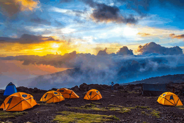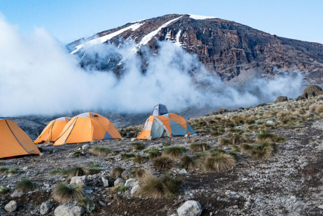 The route now turns east into a semi desert and rocky landscape surrounding Lava Tower, where you reach an altitude of 4630m after about a 5 hours walk. Lunch is served in a designated area before ascending the rocky scree path to Lava Tower (4630m). Definitely the toughest day so far. It is normally around this point, where for the first time, some climbers will start to feel symptoms of breathlessness, irritability and headaches. After lunch you descent again by almost 680m to the Barranco camping area and after reaching the high altitude of 4600m at Lava Tower, the true acclimatization benefit of this day becomes clear. This descent to Barranco camp takes about 2 hours and offers great opportunities to take some beautiful photographs of the Western Breach and Breach Wall. The camp is situated in a valley below the Breach and Great Barranco Wall, which should provide you with a memorable sunset while you wait for the preparation of your dinner and overnight at Barranco Camp site.